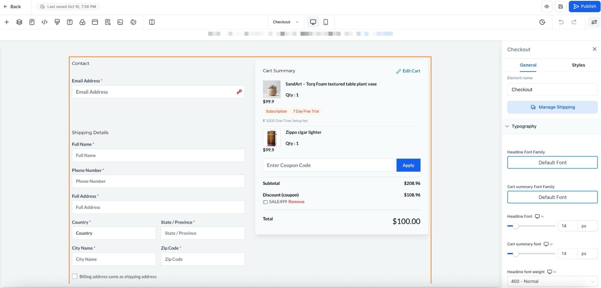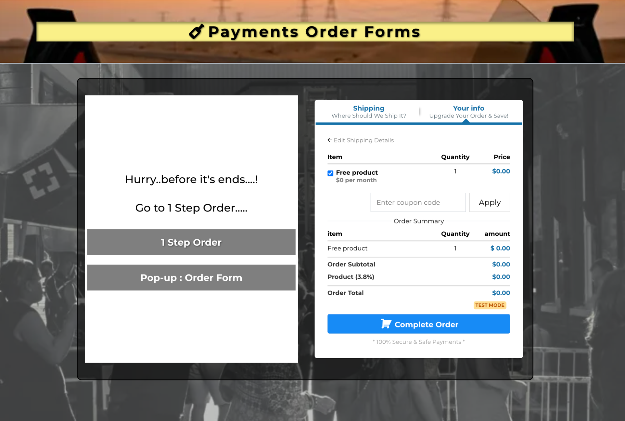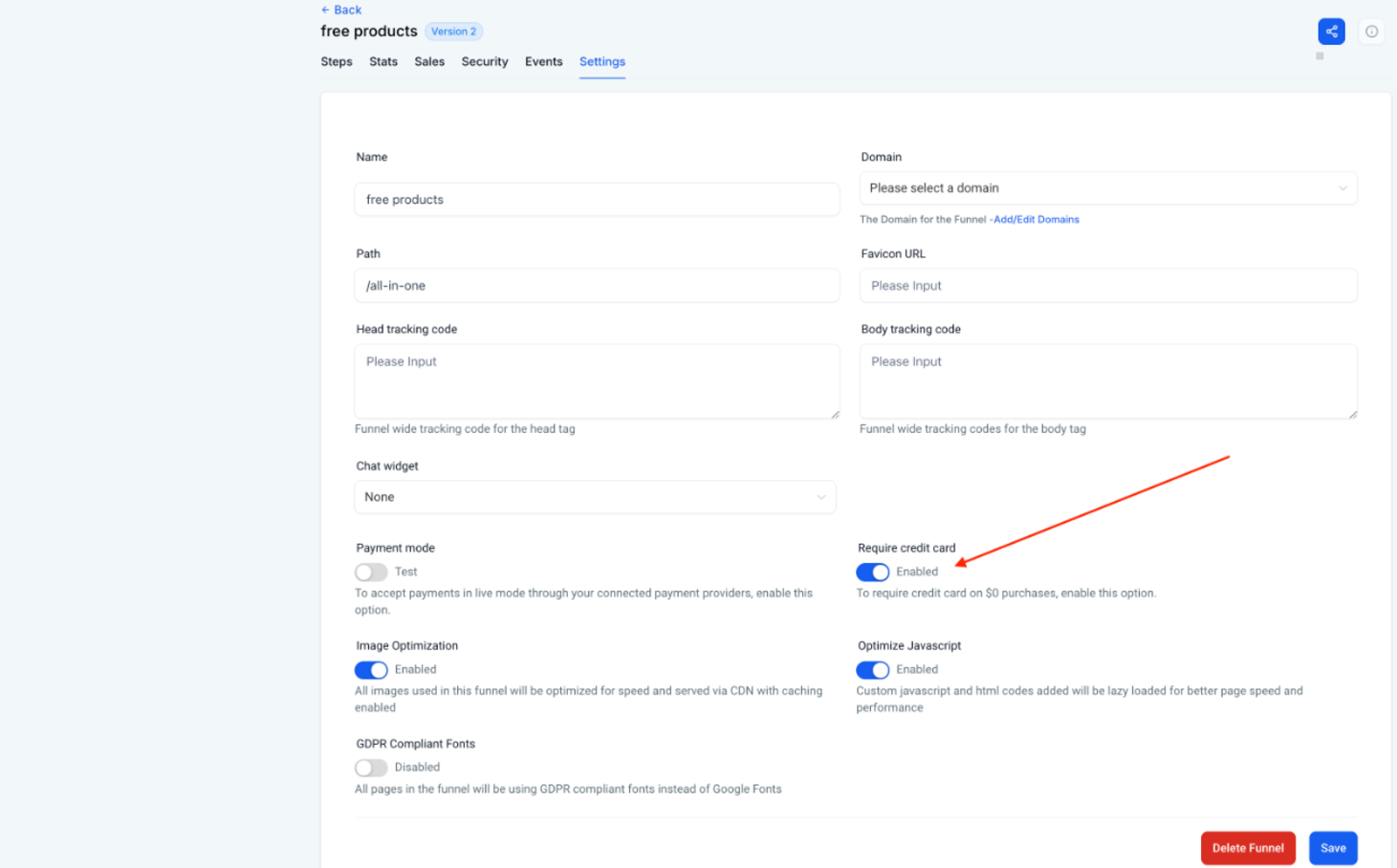 Customers can check out free products without entering credit card details. This feature works with one-step and two-step order forms, online stores, and upsell products. Enable or disable it in Funnel Builder settings. Free checkout applies to one-time products priced at $0 or recurring products with $0 initial and future payments.