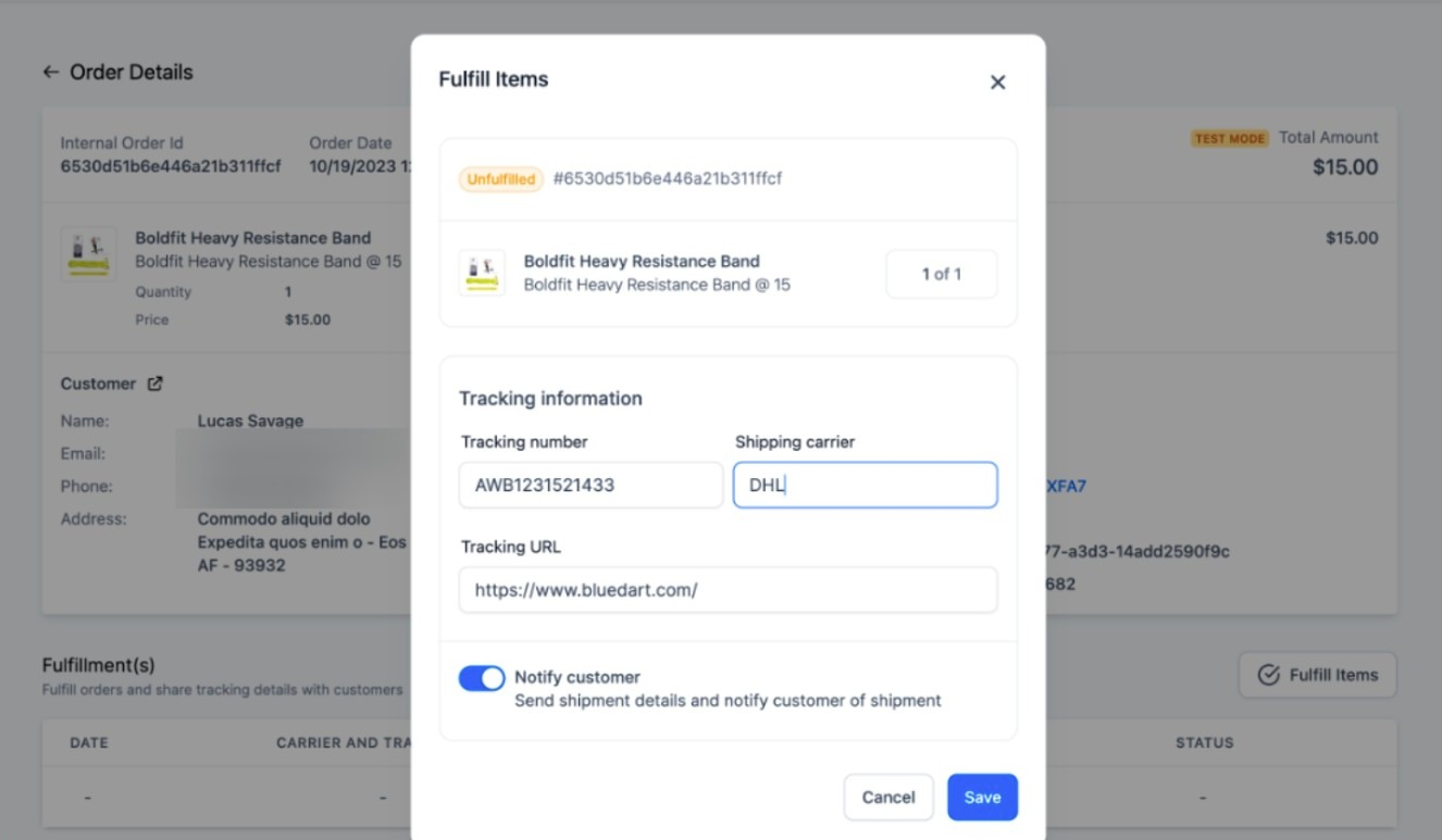 A: Upon receiving an order, it will appear as 'unfulfilled' by default. You can manually mark it as fulfilled and include tracking information for the customer.
