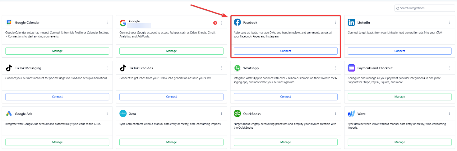 Navigate to Settings > Integrations > Facebook and click Connect. Follow the prompts to allow permissions and access. Ensure you grant all necessary permissions for the integration to work properly.