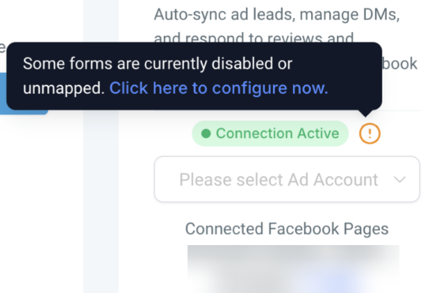 - A warning icon will be displayed if forms are not mapped, with a direct redirection link to Facebook Form Field Mapping.