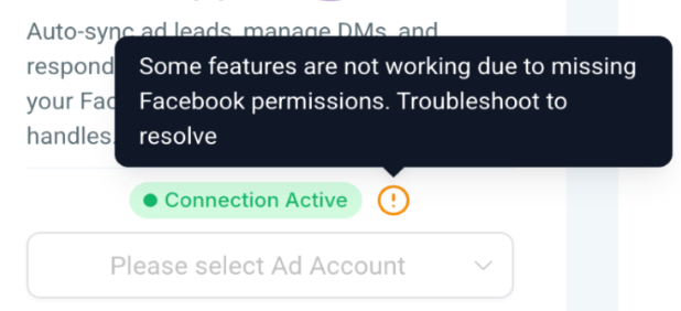 - A warning icon will be shown if permissions are missing, guiding users to troubleshoot their connection.