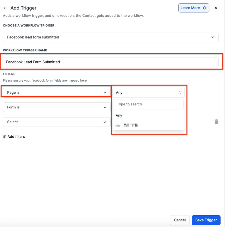 Step 3: Now that Facebook is integrated, you can set up direct Facebook Form Triggers for when a lead form is submitted in Workflows.