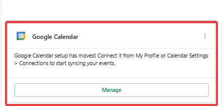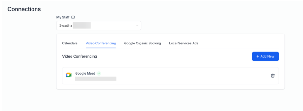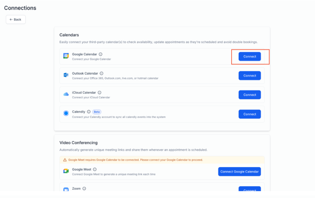 Answer: To connect your Google Calendar, navigate to either "Settings > My Profile > Calendar Settings" or "Calendars > Calendar Settings > Connections Tab." Once connected, Google Meet will be automatically enabled, and Google Meet links will be generated for your appointments, as long as a Google Calendar is linked.