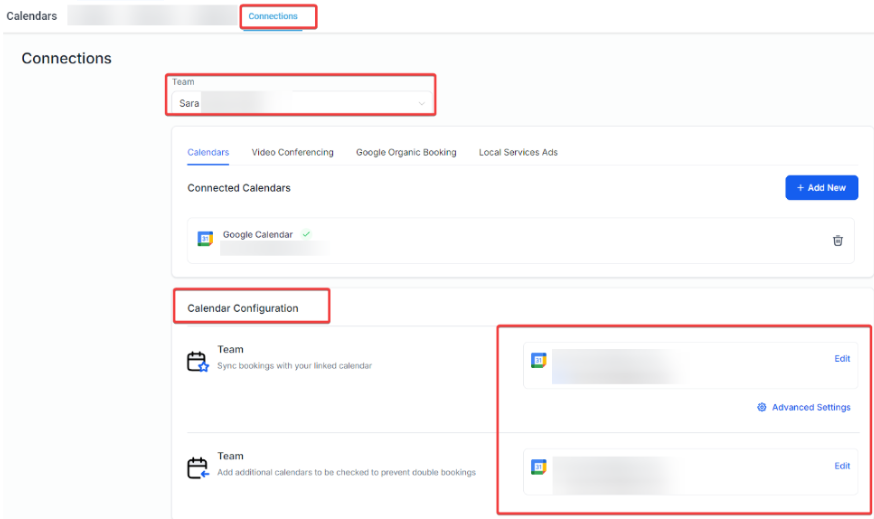 Calendar configuration involves two settings: Linked Calendar & Conflict Calendar. Make sure to select a particular team member.