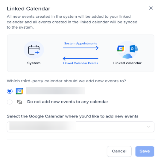 All new events created in the system will be added to your linked calendar. For example, any new event created in the system will sync to your linked calendar, allowing you to view it directly on this third-party calendar (e.g., Google).