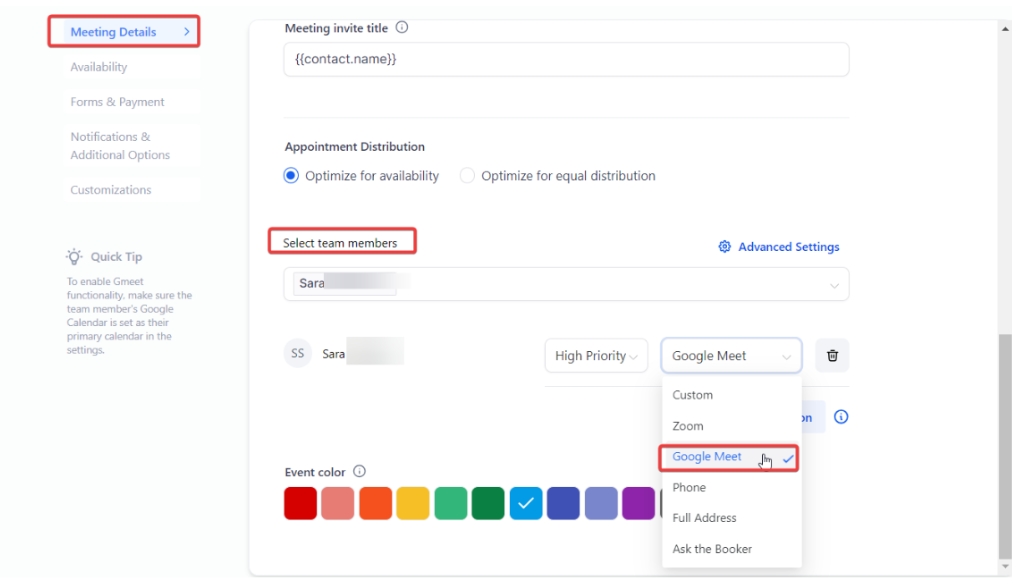 - In Meeting Details, scroll down to select the team member and choose Google Meet as the meeting location.