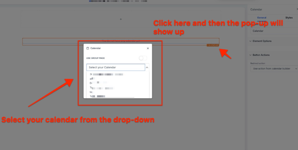 2- Choose the Calendar: After adding the calendar element, select the required calendar from the pop-up. After you are done editing, remember to save the changes.