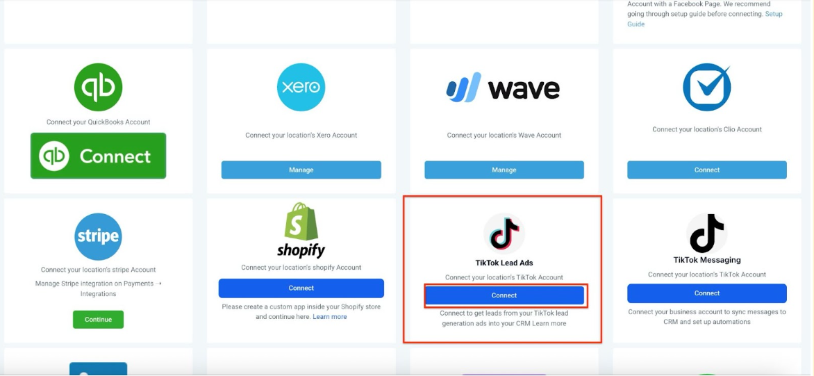 2. Find the TikTok section and click on the Connect button.