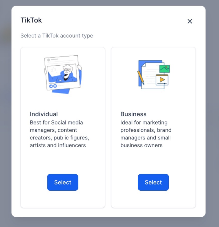1. Choose the account type you want to integrate with (TikTok Personal and Business Account )