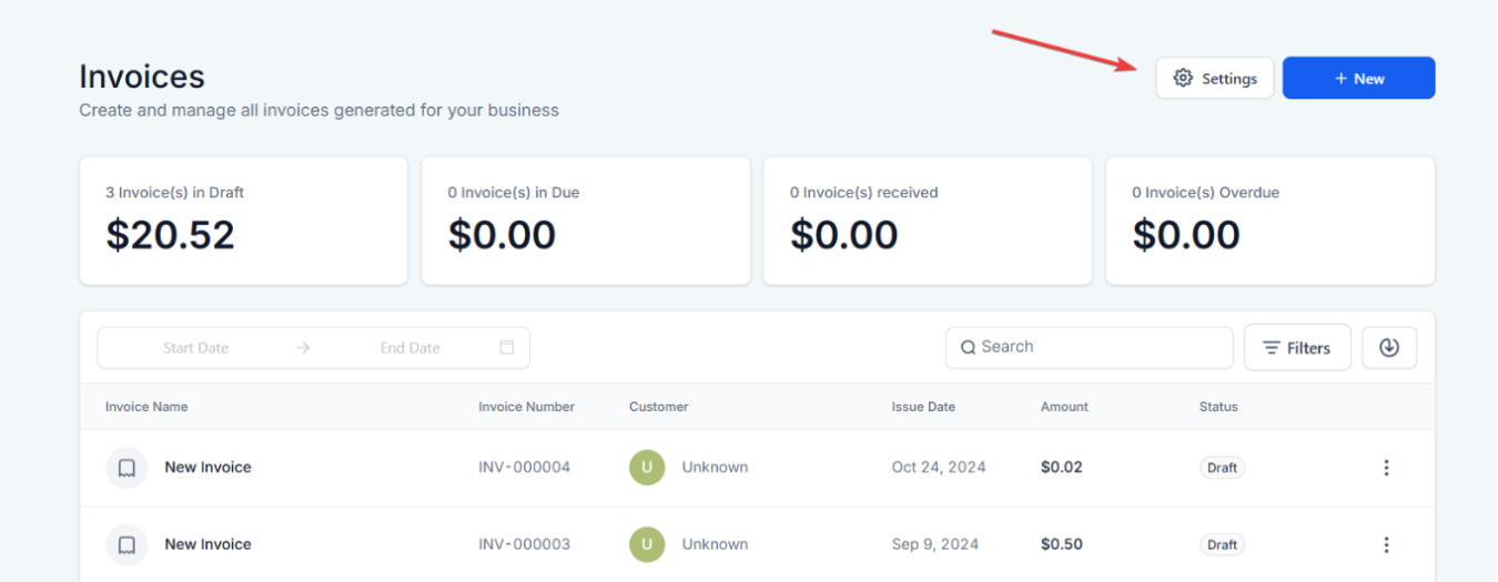 Invoice settings allow you to customize the default title, terms/conditions, and notifications. This article will overview the settings menu and its options.