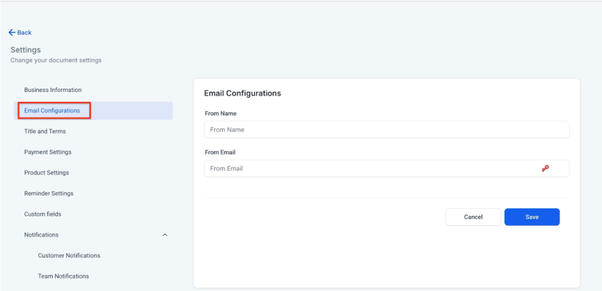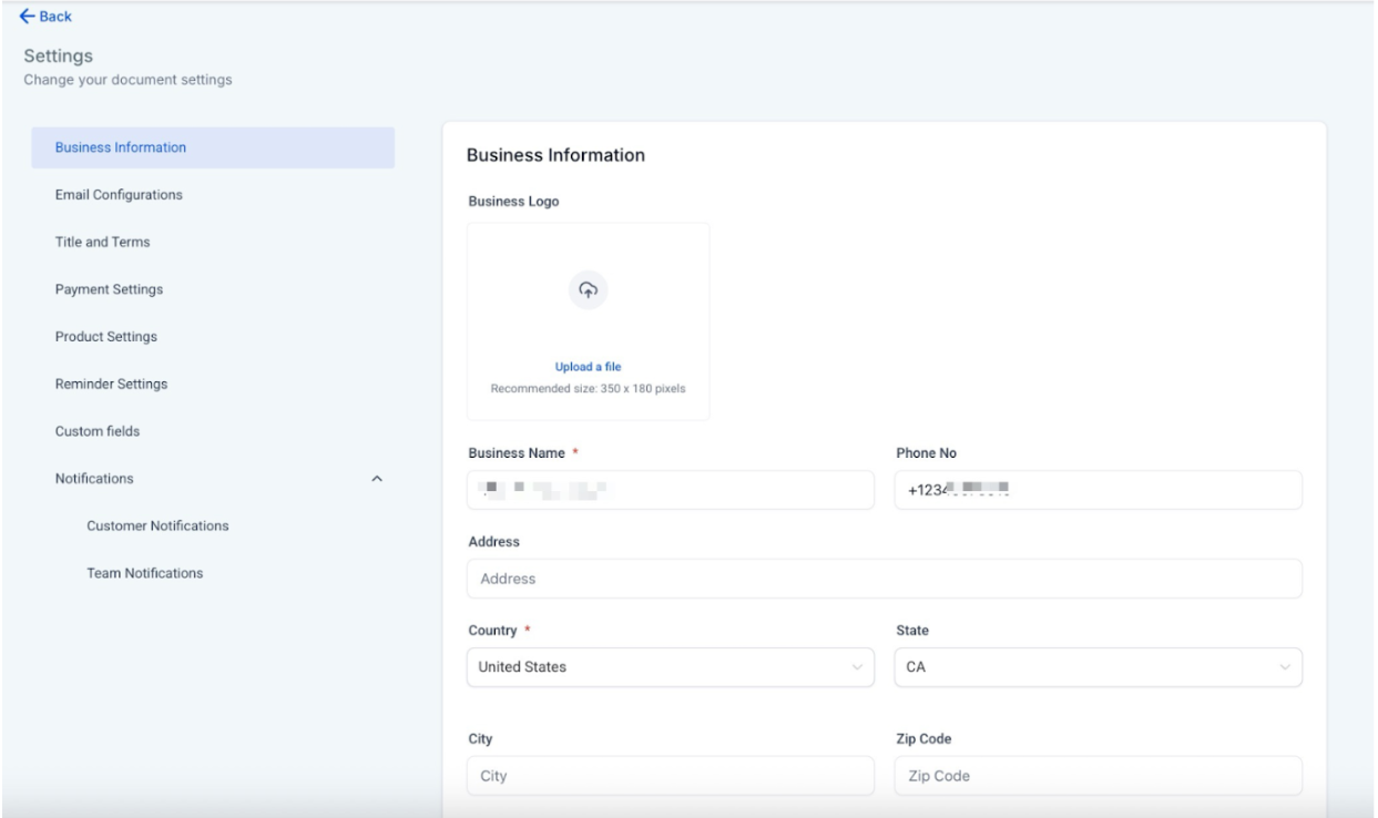 This menu will allow you to customize the Business information such as logo, business name, address, and website, and add custom values