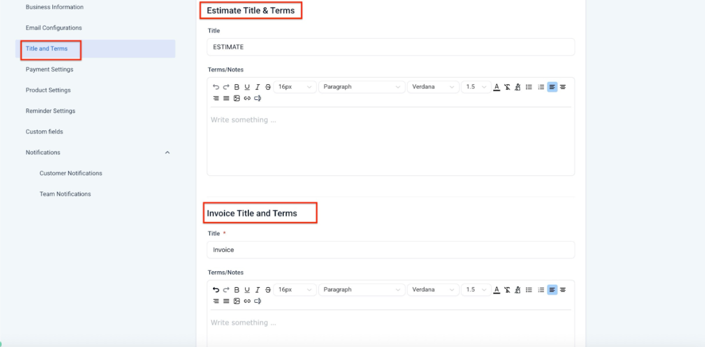 - To customize the title and terms, navigate to Payments > Invoices & Estimates > All Invoices > Settings. You can edit the invoice/estimate title and terms/notes here, and use various formatting options like line breaks and links.