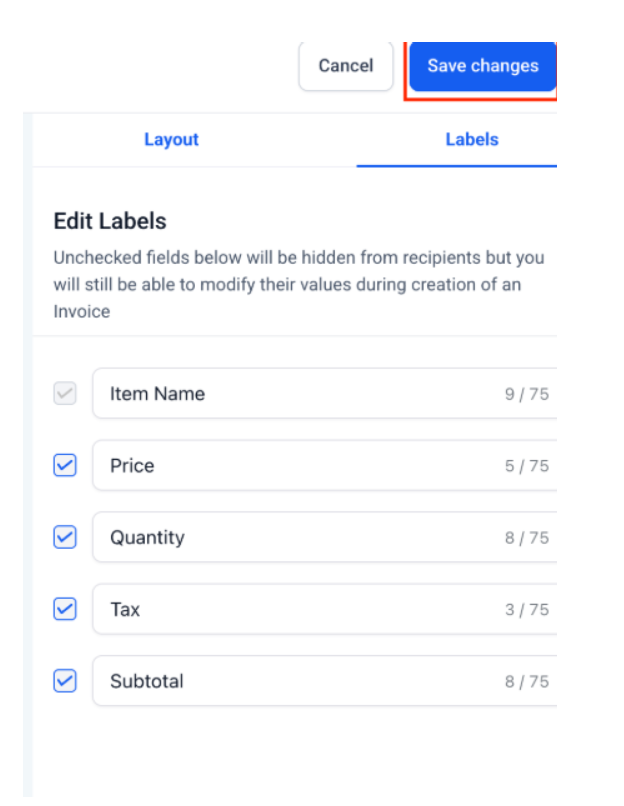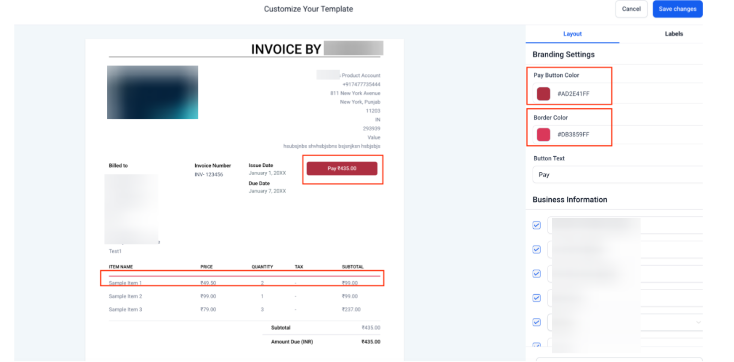 - Go to your invoice settings, open the layout customization panel and make edits such as color, text, and section names.
