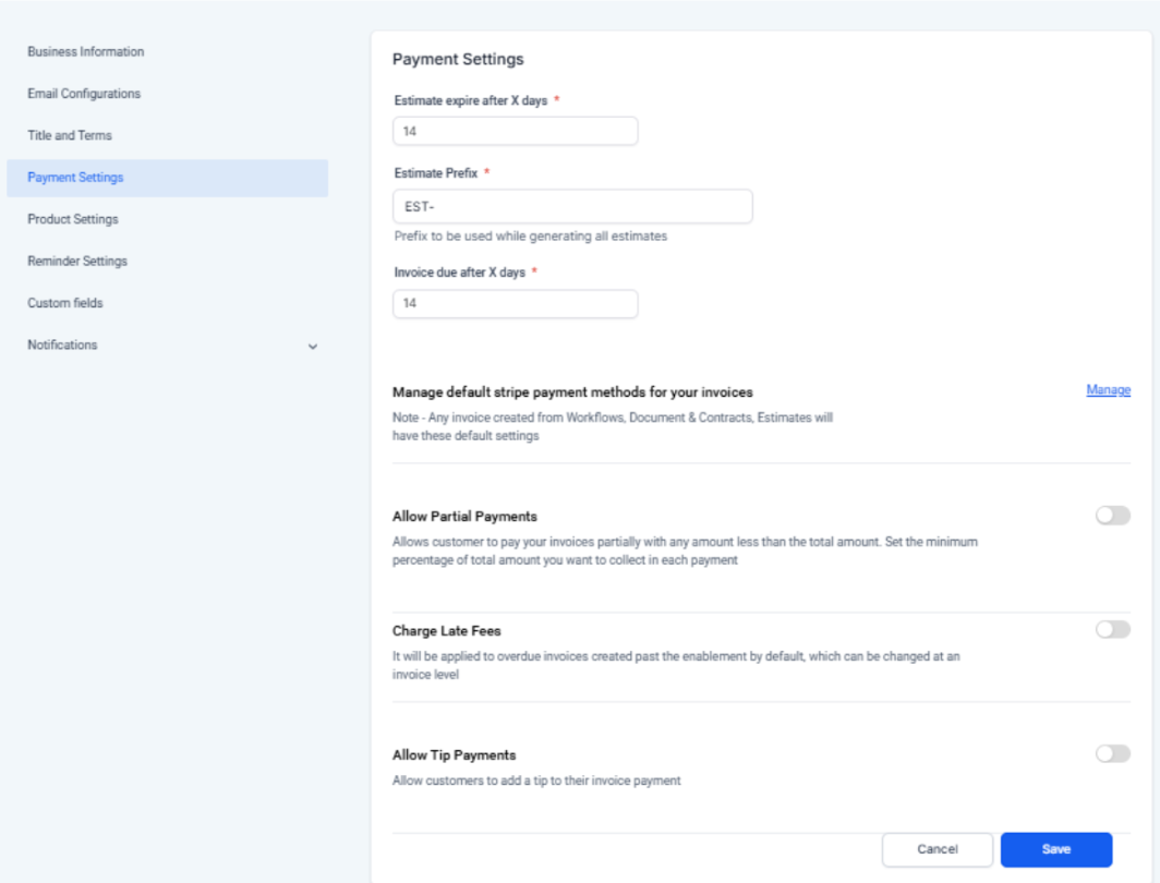 Note: These settings apply automatically to all invoices sent after enabling the feature.