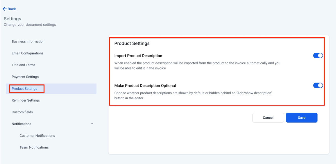 - Yes. Enabling Product Settings allows product descriptions to be automatically imported from your product catalog into invoices. These descriptions can still be edited directly on the invoice if needed.