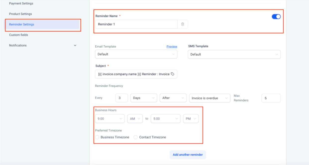 - Additionally, you can send invoice reminders during your operational/business hours, improving convenience for both businesses and customers. You can configure reminders to use either your business’s time zone or the customer’s time zone, ensuring timely and relevant communication.