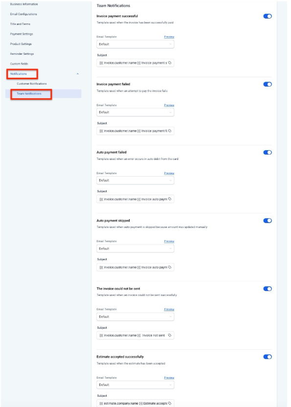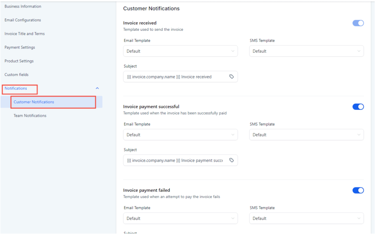These notifications are sent to the business user who sent the invoice. Toggle on or off the type of notification and select templates as desired.