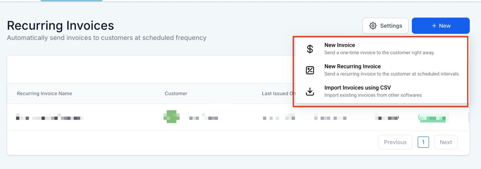 Answer: Navigate to Payments > Invoices & Estimates > Select Recurring Invoices from the dropdown. Click + New and choose New Recurring Invoice to start building your invoice.