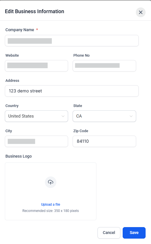- Click on “Business Logo” in the blue box to Select a File to upload your logo to the invoice.