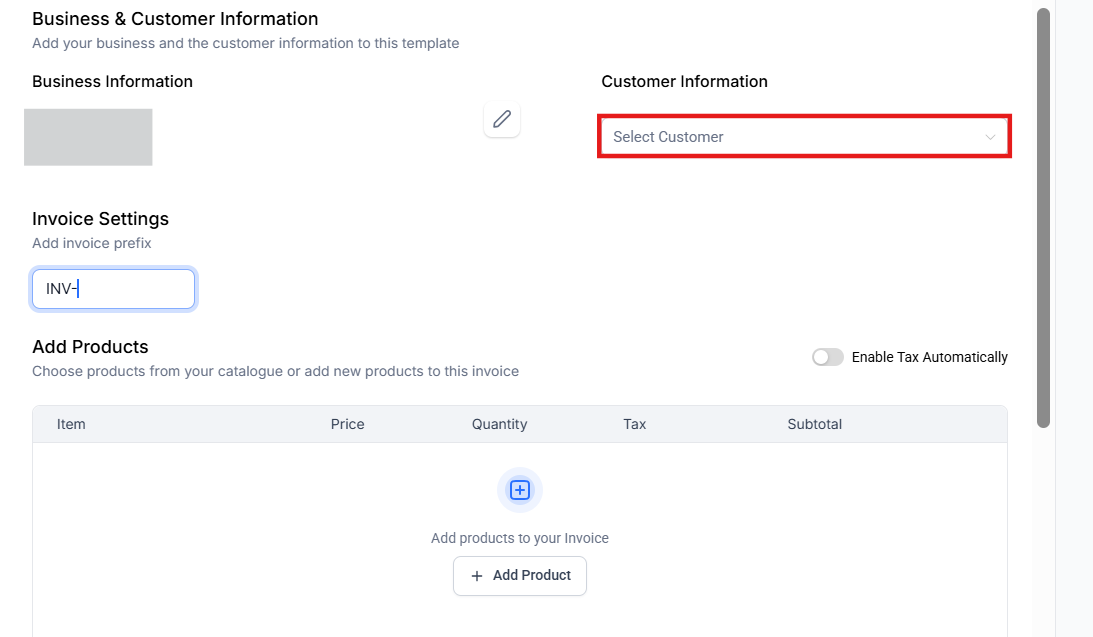 - Press Select Customer and select which of your existing clients you want to send the invoice to, or create a new client by clicking on + Add Customer