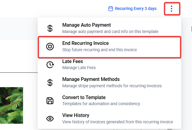 - The other way is within the builder. Click the 3-dot dropdown menu to end the recurring invoice and confirm the message in the popup window.