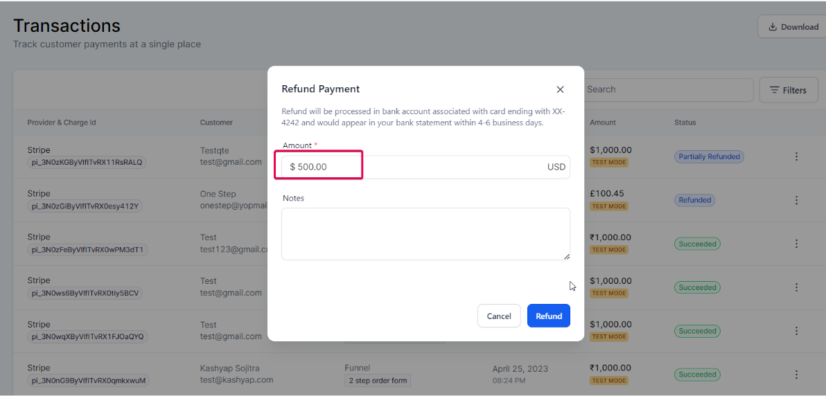 Answer: Yes, the refund processing feature supports transactions made through multiple payment providers, such as Stripe, Authorize.net, NMI, and PayPal, as well as various payment methods, including Google Pay, Apple Pay, and card payments. You can manage refunds for all these from one central platform.