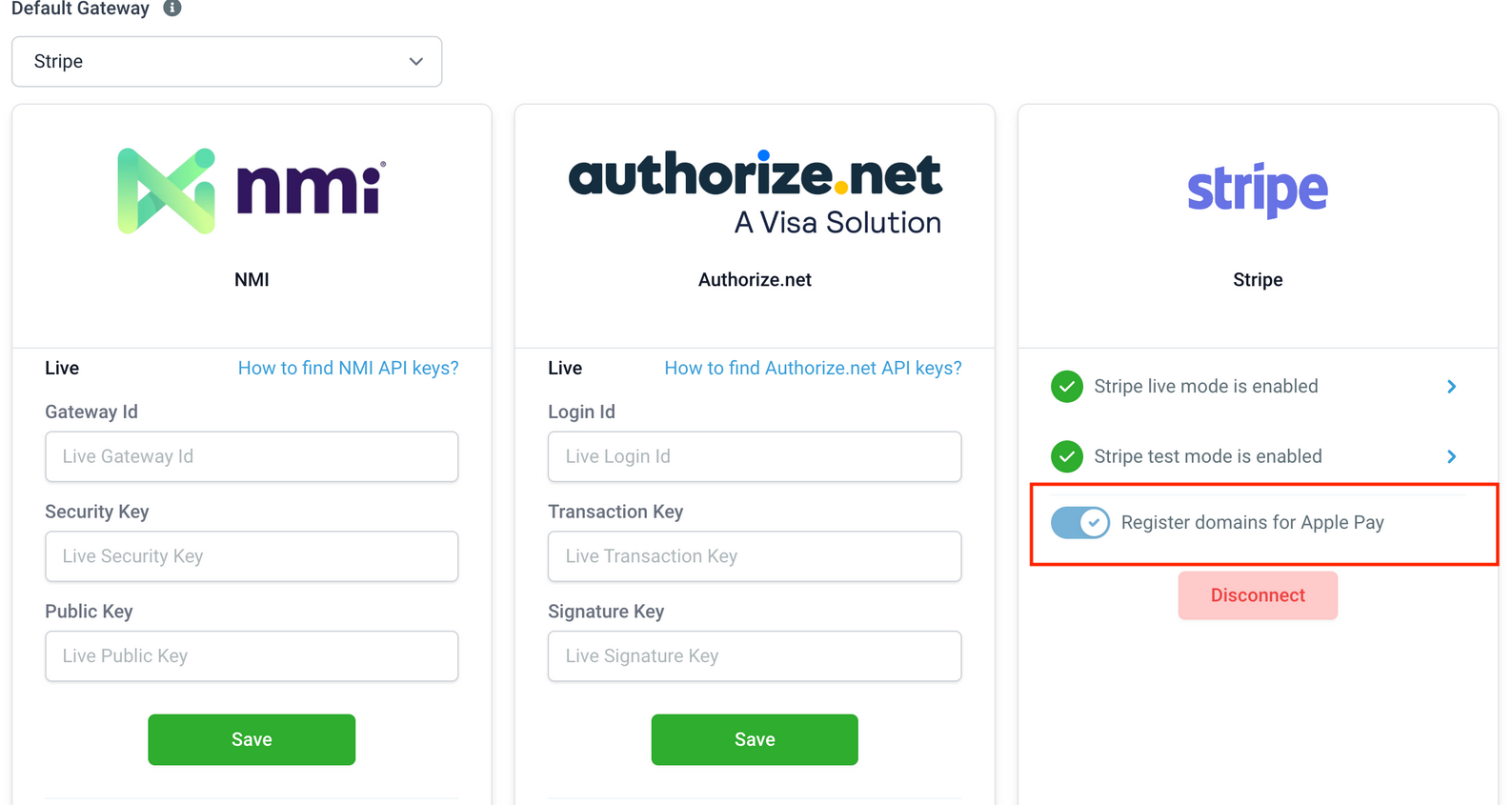 - Ensure that the domain on which the funnel is hosted is registered with Stripe. This is an additional requirement for Apple Pay and should ideally automatically happen as soon as the toggle is turned on.