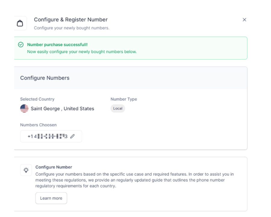 - Once you've completed the purchase, configure and register your number according to your business needs. Ensure it's set up to handle the desired message throughput and other specific requirements.