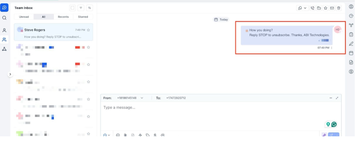 - Automated Opt-Out: To help maintain compliance and build trust, outbound messages automatically include opt-out instructions and sender identification at regular intervals within ongoing conversations.