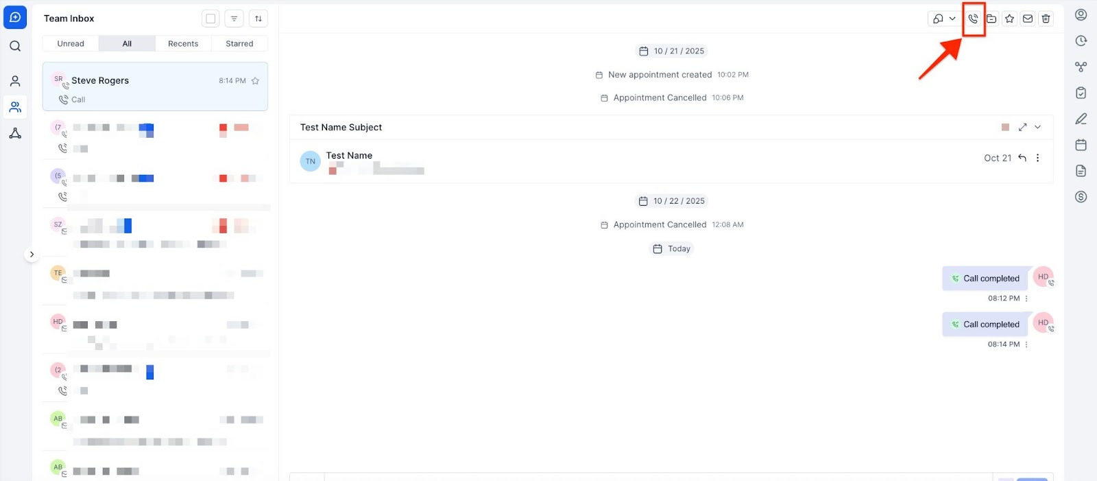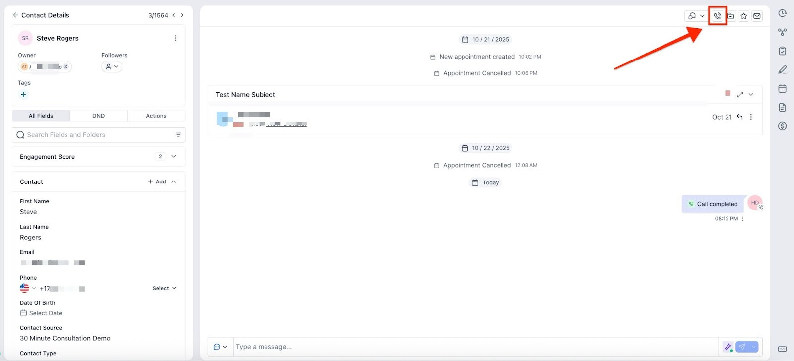 - Click on the contact to open their details, and then click the green call button above the middle conversation section.