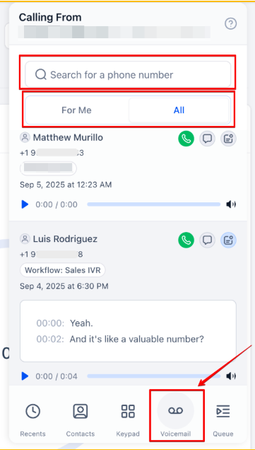 Open the dialer and click the Voicemail tab. View voicemails under the "For Me" tab and click any voicemail to play audio and read the transcription. Use the call or SMS buttons to respond, or search by phone number for specific voicemails.
