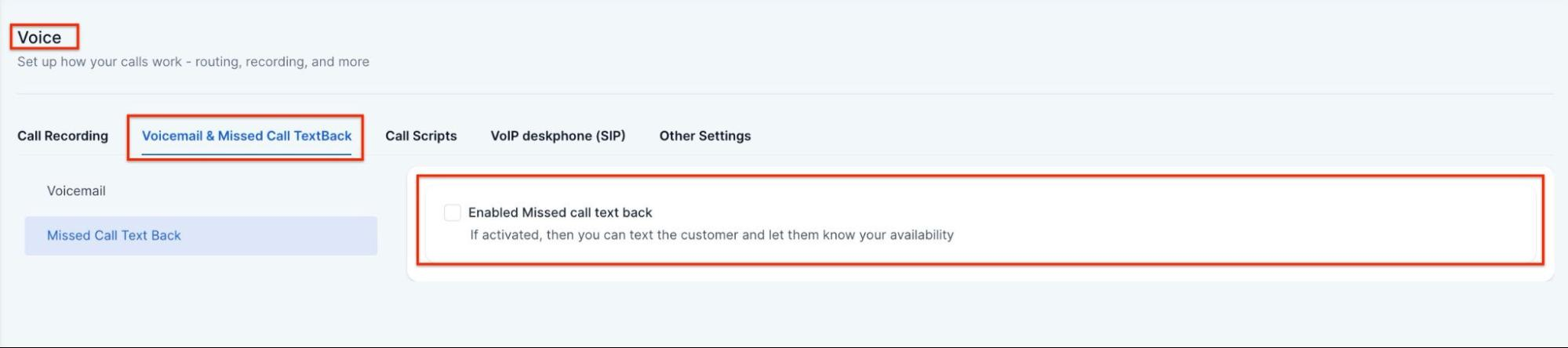 To enable and customize the missed call text back, navigate to Settings (located at the bottom left), go to Phone Numbers, then under Advanced Settings, select Voicemail & Missed Call Textback, and locate the "Missed Call Text Back" option.