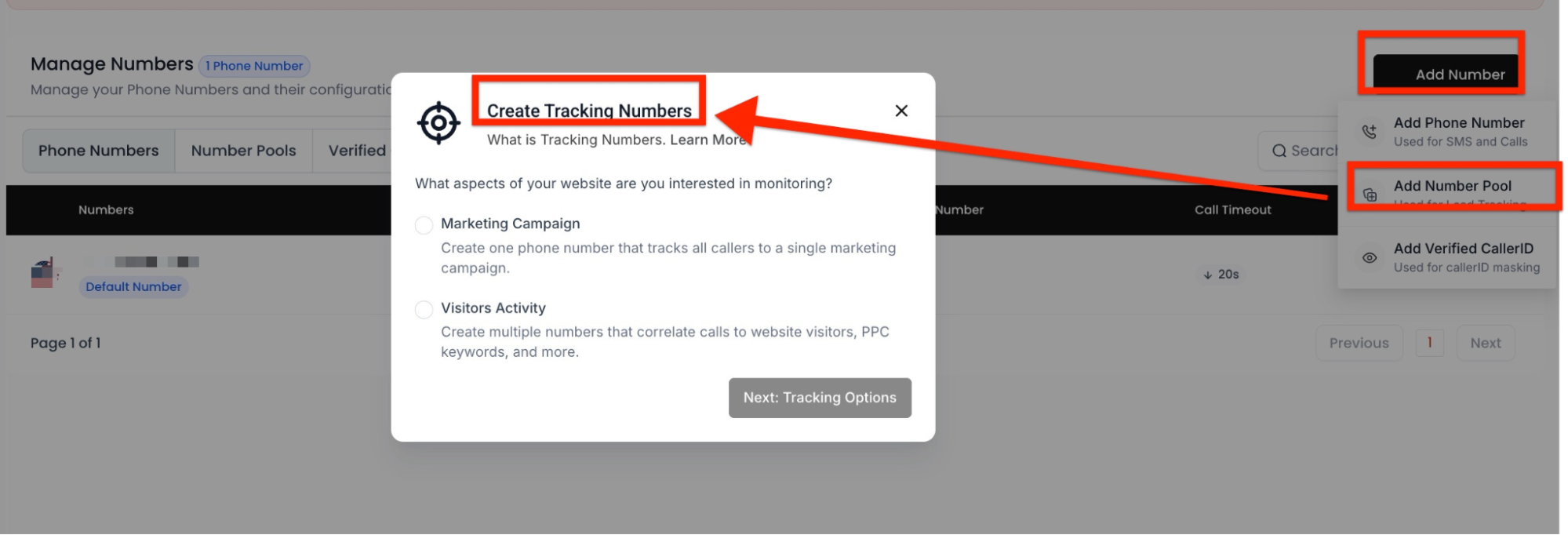 - Access 'Tracking Numbers' under the 'Phone Numbers' page.
