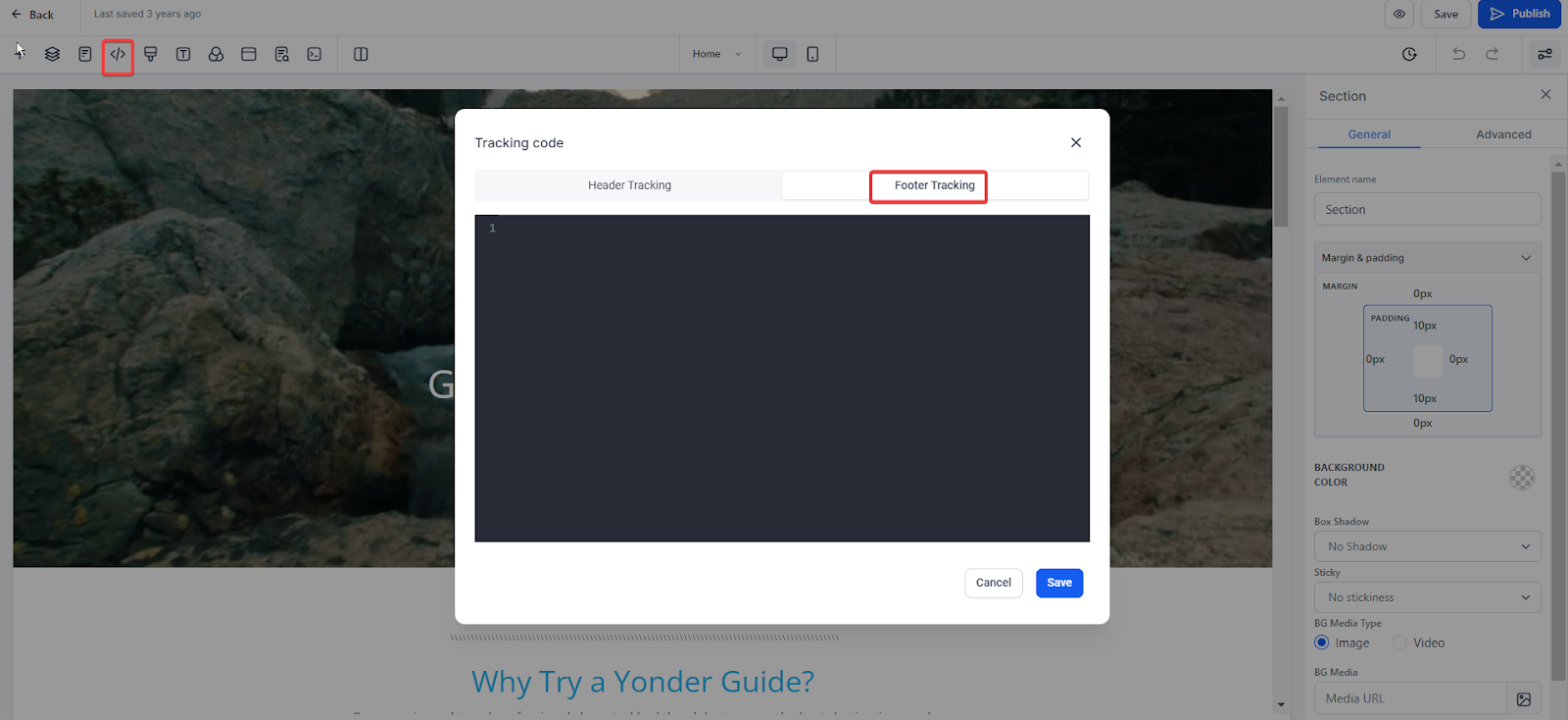 - For specific page tracking, paste the snippet in 'Settings > Tracking Code > Footer Code' on the desired page.