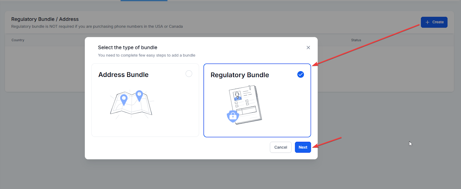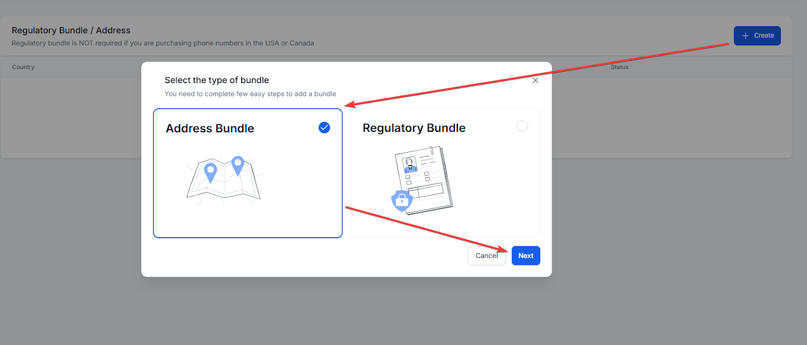 In the Phone Numbers tab, find the option for Address Bundle. Click on it, and then click on the 'Create' button located at the top-right corner of the screen. Then select the ‘Address Bundle’ option.