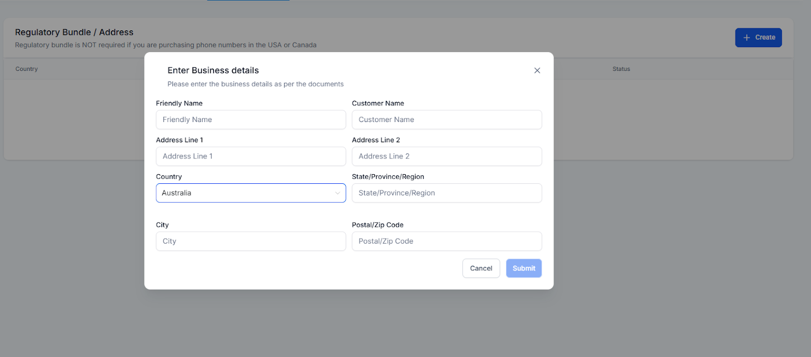 Once the Bundle Address is set up, proceed to create the Regulatory Bundle. Click on 'Create' again, but this time select the option for Regulatory Bundle. Choose Australia as the country and specify the type as Mobile. Proceed to the next step and submit the required business information. When requested to upload identifying documents, you can submit your ASIC document in all entries.