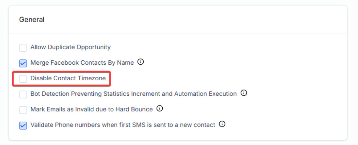 - Check the box next to "Disable Contact Time Zone" to activate this setting.