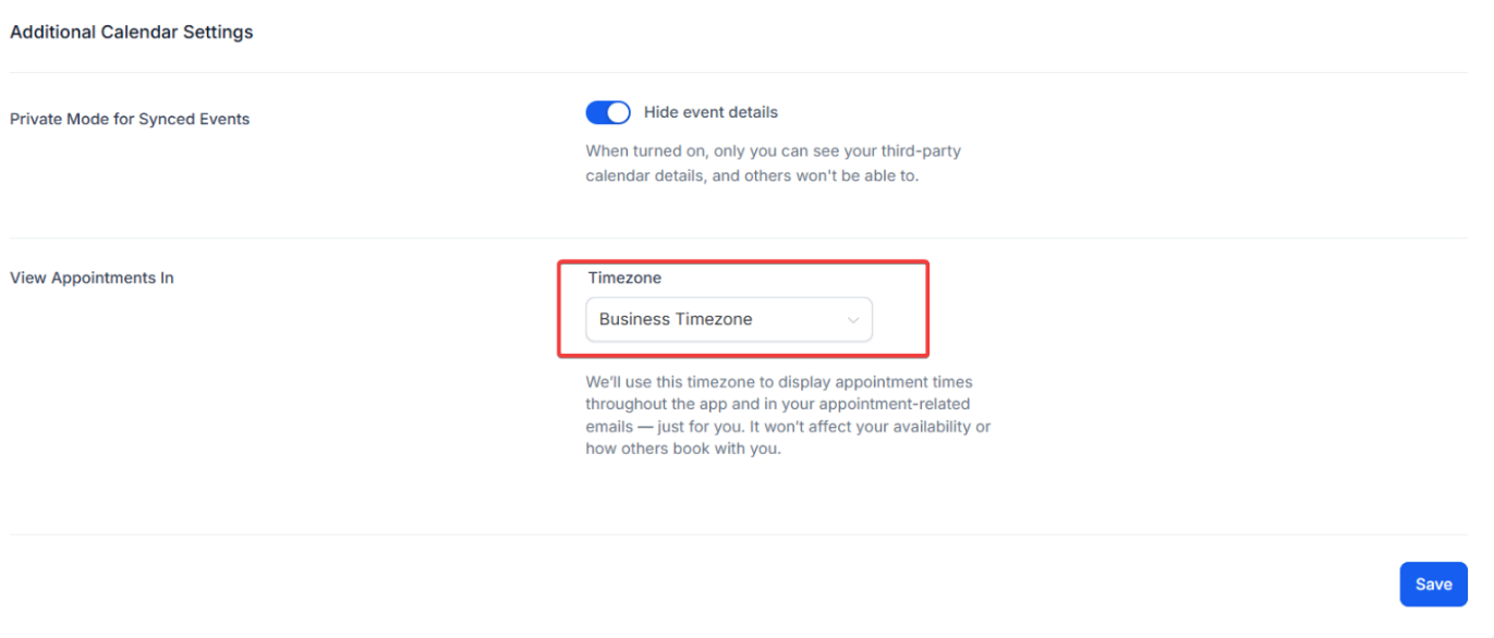 - Changing your time zone will adjust the timing of future appointments and workflows. Existing events may shift based on the new time zone, so review critical schedules after making changes.