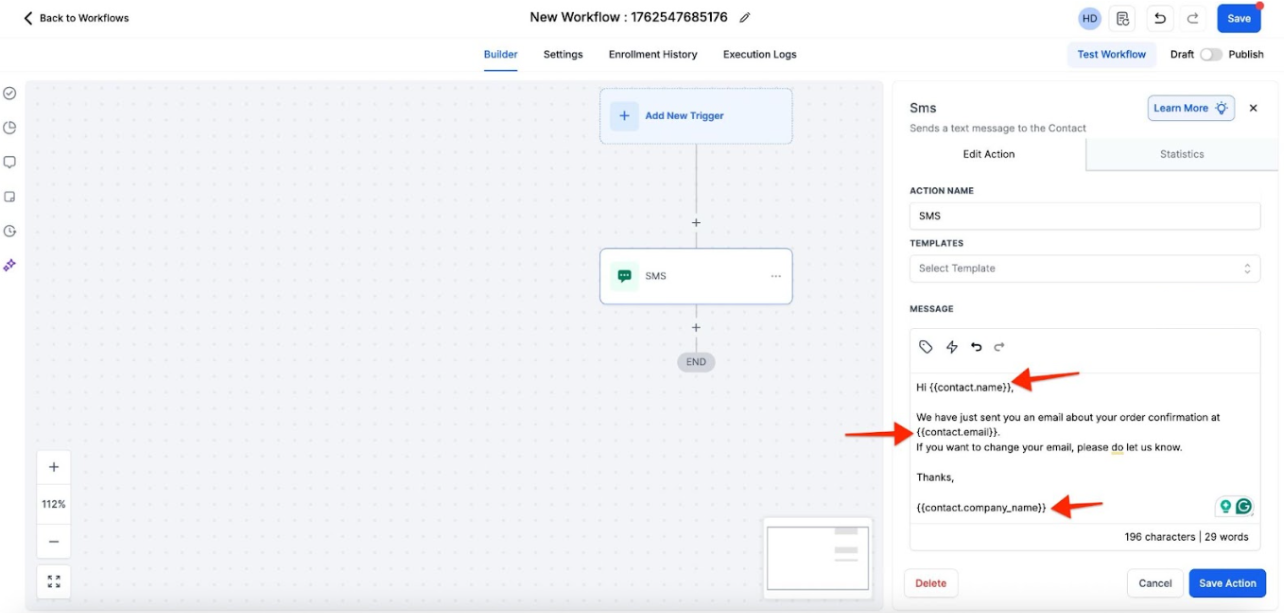 - Purpose: Enable dynamic personalization by inserting specific details like names or order numbers into each message. This enhances engagement and relevance while automating repetitive content for efficiency and accuracy.