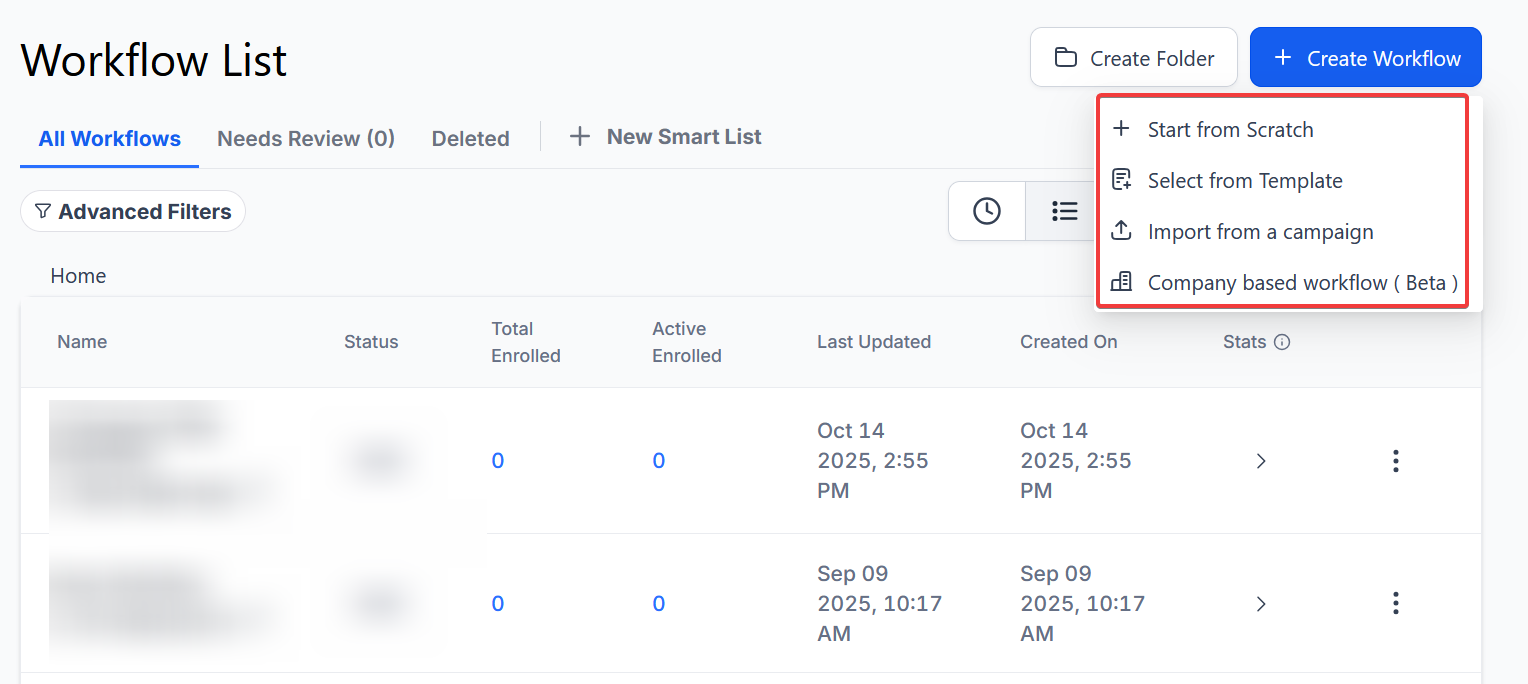 - Use the "+ Create Workflow" button in the upper right to initiate a new workflow.