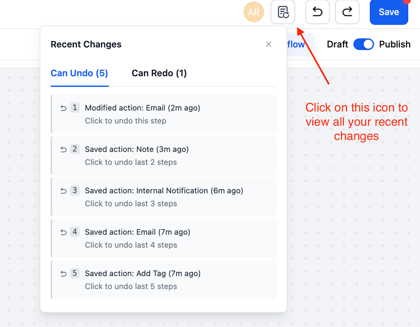 - The workflow builder includes Undo, Redo, and Change History tools for safer and faster editing. These let you easily reverse or reapply steps and view a full list of recent changes.