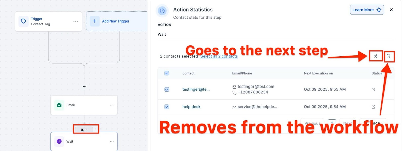 Next to the name and email of the contact, you can click on the Delete button which will remove the contact from the workflow, or the Move to Next Step button to move that contact to the next step in the workflow.
