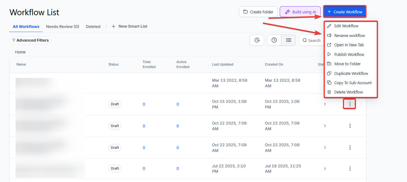 - You can place any published workflow into draft mode from the workflow menu to pause it by clicking on the menu dots. You can resume any workflow by publishing it again in the same way.