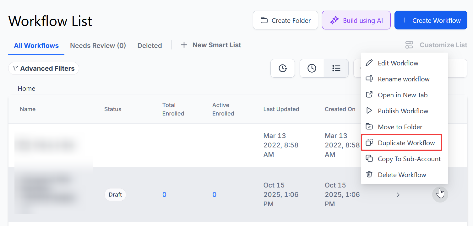 - Navigate to Automation> Workflows, click on the three dots next to the workflow title, and select “Duplicate Workflow.”