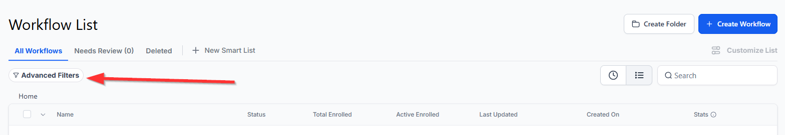 Advanced Filters and Smart List features in workflows allow you to apply multiple criteria to filter workflows and save custom views for quick access.