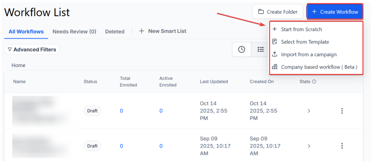 - Start from scratch by navigating to Tools & Reporting > Automations on the left > Workflows at the top, then clicking on the + Create Workflow
