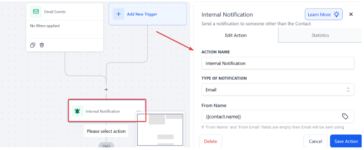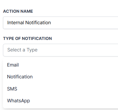 - Select the type of notification from the dropdown. In this example, we will be using the email type Internal Notification.