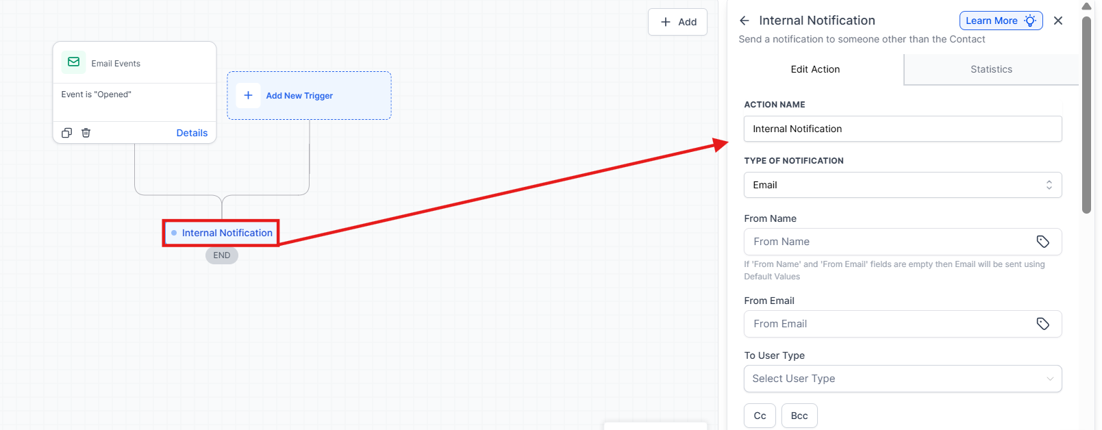 - Click on the “+” symbol to add the action Send Internal Notification