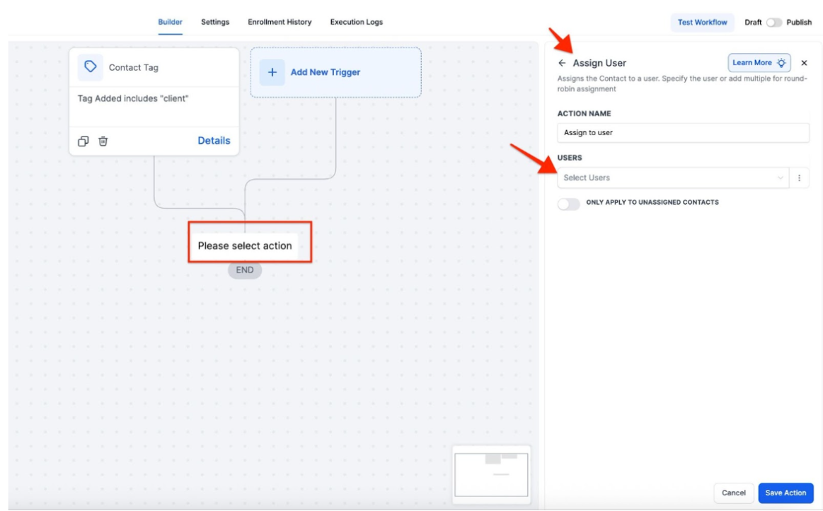 - Note: If you don't specify a tag, the Workflow will trigger on any contact tag, which might not be ideal for your specific needs. Choose the appropriate tag that matches your business use case, such as tags from appointment bookings or tags added to imported contact lists.
