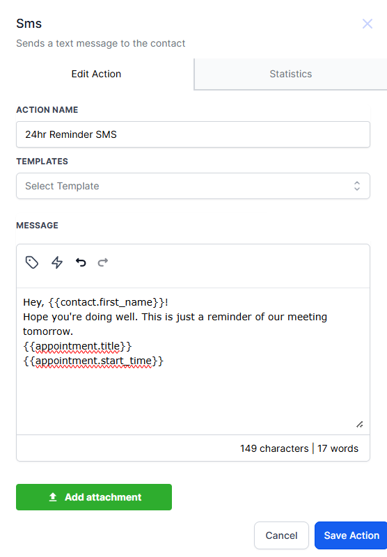 To add an attachment, include a URL link in the "Add Attachment" field when setting up the SMS action.